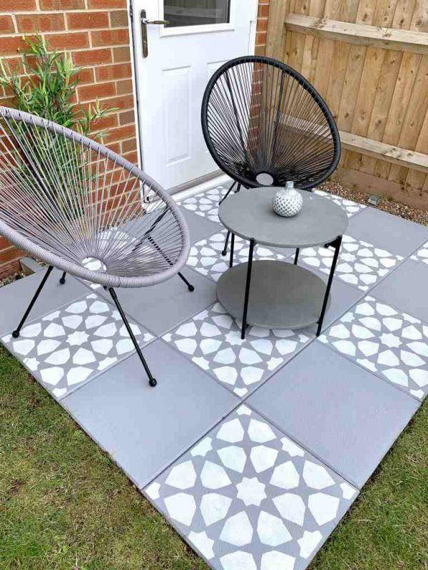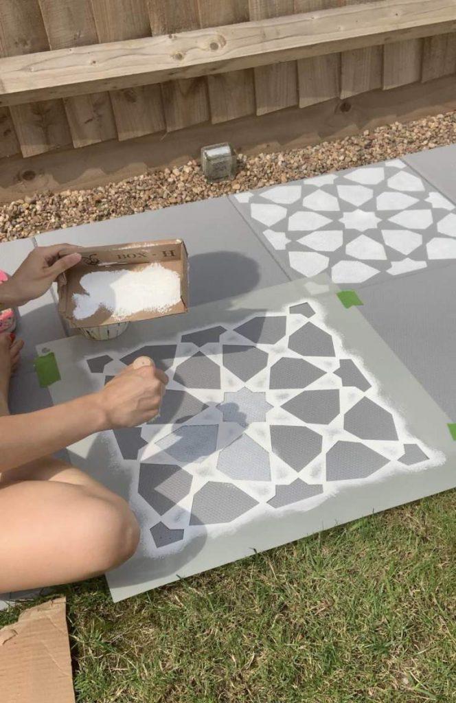 In timp ce vopseam mi-a venit ideea sa ma joc putin cu culorile si am facut niste desene pe pavaj cu ajutorul unor sabloane.